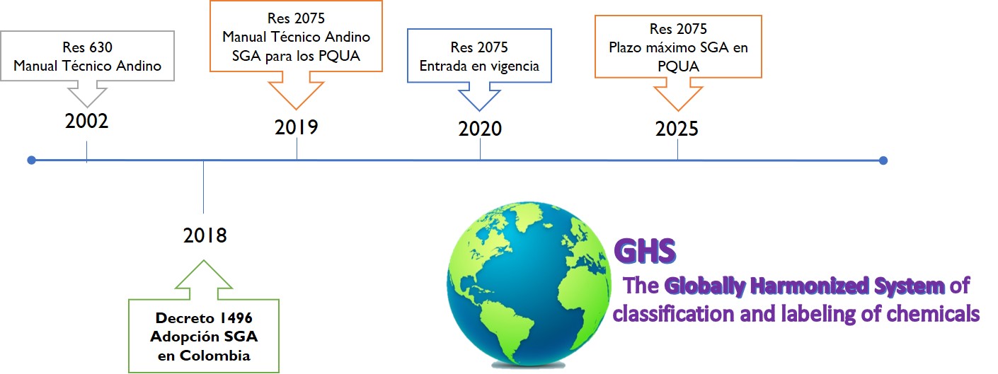 Si bien el artículo 12 del decreto 1496 de 2018 del Ministerio de Trabajo definió que la clasificación y el etiquetado de los PQUA (Plaguicidas Químicos de Uso Agrícola)(1) estaría definido por el Manual Técnico Andino, postergando la implementación del SGA (Sistema Globalmente Armonizado) para este grupo de productos, el pasado 01 de agosto de 2019 la Resolución 2075 de la Secretaría General de la Comunidad Andina derogó la resolución 630 de 2002 de la misma entidad, estableciendo los lineamientos para la aplicación del SGA a los PQUA.